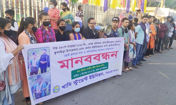মৌলভীবাজারের কুলাউড়ার কর্মধা ইউনিয়নে আদিবাসীদের ভোট প্রদানে বাধা ও হামলায় প্রতিবাদে সিলেটে মানববন্ধন করেছে খাসি স্টুডেন্ট ইউনিয়ন।