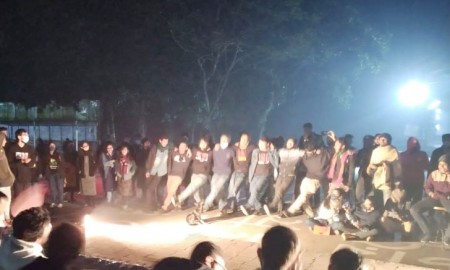 রবিবার (৩০ জানুয়ারি) রাতে ‘গীতি আলেখ্য’ নামক সাংস্কৃতিক অনুষ্ঠানের আয়োজন করেন আন্দোলনরত শিক্ষার্থীরা। অন্যান্য দিনের ধারাবাহিকতায় এদিন সন্ধ্যা থেকে বিশ্ববিদ্যালয়ের গোলচত্বরে গানে গানে প্রতিবাদ কর্মসূচি পালন করেন তারা। এই প্রতিবাদে শাহ আব্দুল করিম, রাধারমণ দত্তের গান গায় তারা। এ সব গানের মধ্যে মধ্যেই বিশ্ববিদ্যালয়ের বিভিন্ন সমস্যা ও ঘটনা তুলে ধরেন শিক্ষার্থীরা।