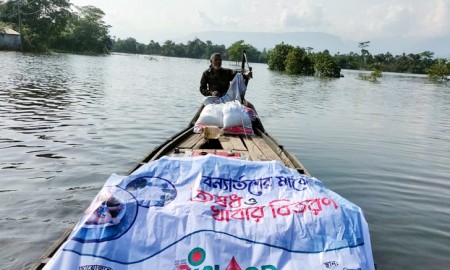 ট্রলারে করে বন্যাকবলিত গ্রামের ভেতরে দূর্গত এলাকায় গিয়ে অসহায় মানুষের হাতে ত্রাণ পৌছে দেন তারা।