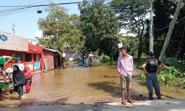 গতকাল সরজমিনে দেখা যায় কয়েকজন শ্রমিক রাস্তার পূর্বপাশে বালিভরাট করে বস্তা দিয়ে বাধ দেওয়ার চেষ্ঠা করছেন।বেশ স্রোত্রে পানি প্রবাহিত হওয়ায় এবং সেই সাথে ভারী যানবাহন চলাচলে রাস্তার পুর্বপাশে বড় গর্তের সৃষ্টি হওয়ায় বর্তামানে এক পাশ দিয়ে যান চলাচল করছে।এতে রাস্তার দুপাশে গাড়ির দীর্ঘ লাইন পড়ে যায়।