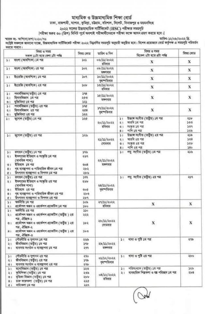 ২০২২ সালের এইচএসসি পরীক্ষা শুরু হবে আগামী ৬ নভেম্বর। তত্ত্বীয় এই পরীক্ষা শেষ হবে ১৩ ডিসেম্বর। আর ১৫ ডিসেম্বর শুরু হবে ব্যবহারিক পরীক্ষা।