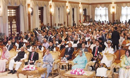 ডেপুটি স্পিকার, সংসদে বিরোধী দলের উপনেতা জি এম কাদের, জাতীয় সংসদের হুইপ, সংসদ সদস্য, কূটনৈতিক মিশনের প্রধান, বিভিন্ন আন্তর্জাতিক সংস্থার প্রধান, প্রতিমন্ত্রী, প্রধান নির্বাচন কমিশনার, সুপ্রিম কোর্টের বিচারক, বিভিন্ন ট্রাইব্যুনাল বা কমিশন বা ইনস্টিটিউটের প্রধান, জাতীয় রাজনৈতিক নেতা, তিন বাহিনীর প্রধান, প্রধানমন্ত্রীর মুখ্য সচিব, বিভিন্ন দেশের কূটনীতিক, বিভিন্ন জাতীয় পত্রিকার সম্পাদকসহ সিনিয়র সাংবাদিক এবং উচ্চপদস্থ বেসামরিক ও সামরিক কর্মকর্তাসহ ১ হাজার ১০০ জনের বেশি আমন্ত্রিত অতিথি অনুষ্ঠানে উপস্থিত ছিলেন।