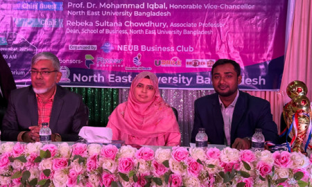 অনুষ্ঠানে প্রধান অতিথির বক্তব্য দেন নর্থ ইস্ট ইউনিভার্সিটি বাংলাদেশের উপাচার্য অধ্যাপক ড. মোহাম্মদ ইকবাল। |
