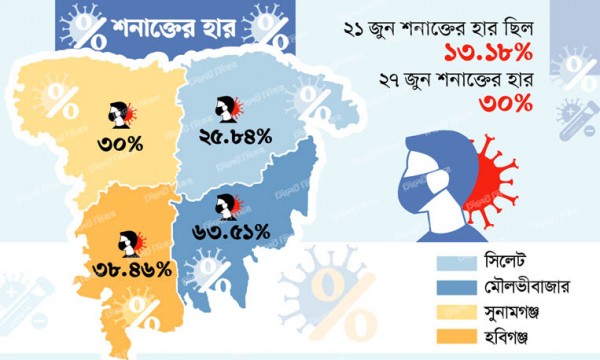 করোনায় বিপর্যস্ত সিলেট বিভাগ। প্রতিদিন বাড়ছে শনাক্তের সংখ্যা। গত এক সপ্তাহে নমুনা পরীক্ষা বিবেচনায় শনাক্ত বেড়েছে দ্বিগুণের বেশি। গত ২১ জুন বিভাগে নমুনা বিবেচনায় শনাক্তের হার ছিল ১৩ দশমিক ১৮ শতাংশ। আর এক সপ্তাহ পর ২৭ জুন তা বেড়ে দাঁড়িয়েছে ৩০ শতাংশে।