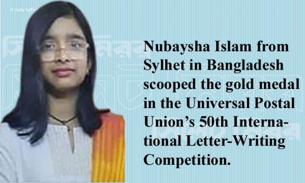 পত্র লেখায় বিশ্ব জয় করেছে সিলেটের নগরের আনন্দ নিকেতনের ছাত্রী নুবায়শা ইসলাম। বিশ্ব ডাক সংস্থার (ইউনিভার্সাল পোস্টাল ইউনিয়ন (ইউপিইউ) আয়োজিত ৫০তম পত্র লিখন প্রতিযোগিতায় নুবায়শা স্বর্ণপদক লাভ করেছে। গত ২৭ আগস্ট আইভেরি কোস্টের আবিদজানে অনুষ্ঠিত কংগ্রেসে তাঁর নাম ঘোষণা করেন ইউপিইউ'র মহাপরিচালক বিশার এ হোসেইন। প্রতিযোগিতায় দ্বিতীয় হয়েছে নর্থ মেসিডোনিয়ার ব্রুনো ইভানোভস্কি ও তৃতীয় হয়েছে ভিয়েতনামের দাও আনহথু।