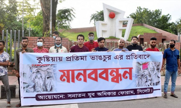 কুষ্টিয়ায় প্রতিমা ভাঙচুরের প্রতিবাদে সিলেটে সনাতন যুব অধিকার ফোরামের মানববন্ধন অনুষ্ঠিত হয়েছে। শনিবার বিকেলে সিলেট কেন্দ্রীয় শহীদ মিনারের প্রাঙ্গনে এ মানববন্ধনের আয়োজন করা হয়।