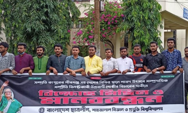 সারাদেশে চলমান সাম্প্রদায়িক সহিংসতার প্রতিবাদে বিক্ষোভ-সমাবেশ এবং মানববন্ধন করেছে শাহজালাল বিজ্ঞান ও প্রযুক্তি বিশ্ববিদ্যালয়ের (শাবিপ্রবি) ছাত্রলীগের নেতৃবৃন্দ।
