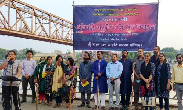 ‘সাম্প্রদায়িক অপশক্তির উত্থান রোধ করি সাম্প্রদায়িক হামলার বিরুদ্ধে প্রতিরোধ গড়ি’- স্লোগানে সাম্প্রতিক সময়ে বাংলাদেশে ঘটে যাওয়া সাম্প্রদায়িক সন্ত্রাসের প্রতিবাদে বাংলাদেশ আবৃত্তি সমন্বয় পরিষদ সিলেটে প্রতিবাদী আবৃত্তি ও বিক্ষোভ সমাবেশের করেছে।