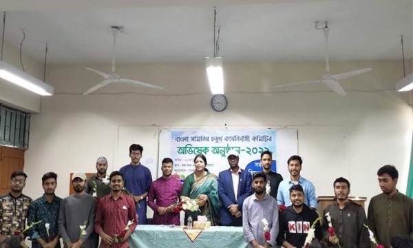 অভিষেক অনুষ্ঠানে বাংলা বিভাগের প্রধান অধ্যাপক ফারজানা সিদ্দিকা সভাপতিত্বে এবং সমিতির কোষাধ্যক্ষ সহকারী অধ্যাপক আবু বকর সিদ্দিকের সঞ্চালনায় উপস্থিত ছিলেন অধ্যাপক ড. আব্দুর রহিম, অধ্যাপক ড. রেজাউল ইসলাম, অধ্যাপক ড. শিরিন আক্তার সরকার, অধ্যাপক ড. মো. জফির উদ্দিন, সহকারী অধ্যাপক মনিরুল ইসলাম, সহকারী অধ্যাপক সঞ্জয় বিক্রম, সহ-সভাপতি ওমর ফারুক, সাধারণ সম্পাদক শেখ দেলোয়ার হোসেনসহ সমিতির নবনির্বাচিত সদস্য ও শিক্ষার্থীরা।