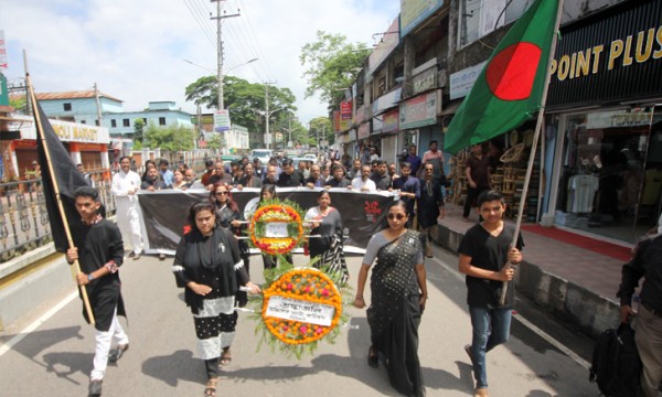 জাতীয় শোক দিবস উপলক্ষে নগরে শোক মিছিল করেছে সম্মিলিত নাট্য পরিষদ সিলেট।