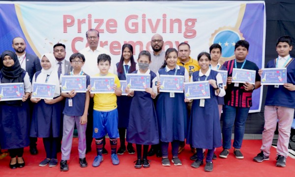 পুরস্কার বিতরণ অনুষ্ঠানে অতিথিদের সঙ্গে বিজয়ী শিক্ষার্থীরা।