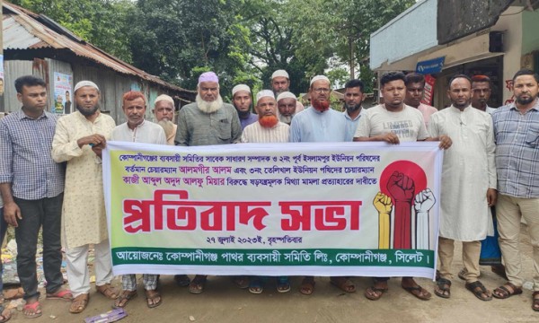 বৃহস্পতিবার (২৭ জুলাই) বেলা ১টায় উপজেলার থানাসদর বাজারে কোম্পানীগঞ্জ পাথর ব্যবসায়ী সমিতির সভাপতি আব্দুল জলিলের সভাপতিত্বে সহ সভাপতি মাওলানা আব্দুর রউফের পরিচালনায় প্রতিবাদ সভা অনুষ্ঠিত হয়।