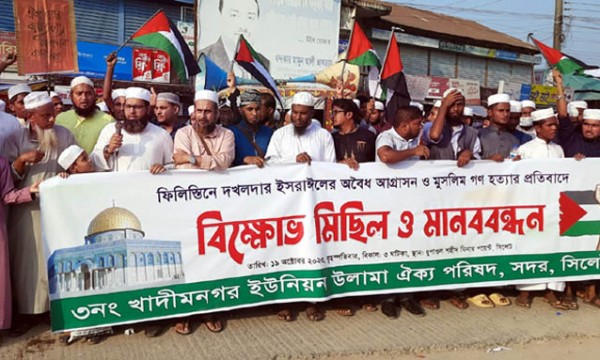 ফিলিস্তিনে ইসরাইলি গণহত্যার প্রতিবাদ ও বন্ধের দাবীতে সিলেট সদর উপজেলার ৩নং খাদিমনগর ইউনিয়ন উলামা ঐক্য পরিষদের ডাকে বিশাল মানববন্ধন ও বিক্ষোভ মিছিল অনুষ্ঠিত হয়েছে। বৃহস্পতিবার ইউনিয়নের ধুপাগুল শহীদ মিনারের সামনে এই মানববন্ধন অনুষ্ঠিত হয়।