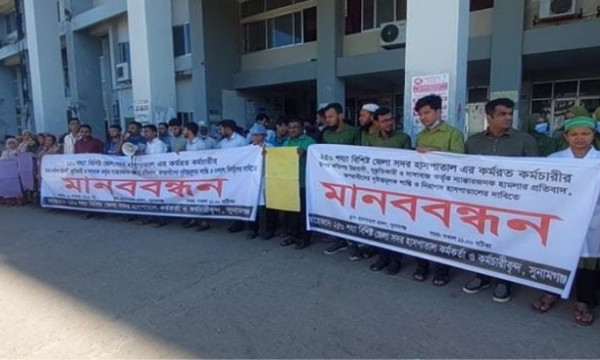 হাসপাতালের কর্মচারীকে মারধরের প্রতিবাদে সুনামগঞ্জে মানববন্ধন