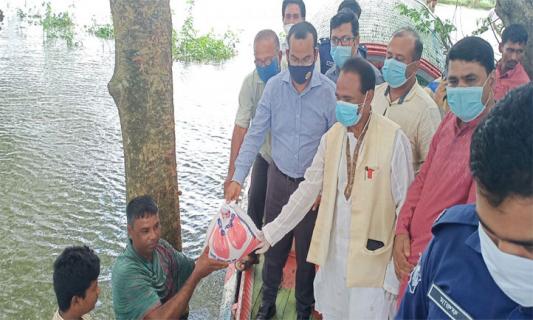 দিরাইয়ে ত্রাণ নিয়ে বানভাসিদের বাড়িতে জেলা প্রশাসক