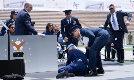 এবার হোঁচট খেয়ে বিমানবাহিনীর অনুষ্ঠান মঞ্চে পড়ে গেলেন বাইডেন