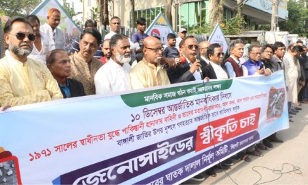 সিলেটে ৭১’র গণহত্যার আন্তর্জাতিক স্বীকৃতির দাবিতে মানববন্ধন