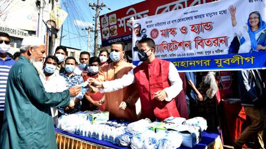 নগরে যুবলীগের মাস্ক ও হ্যান্ড স্যানিটাইজার বিতরণ