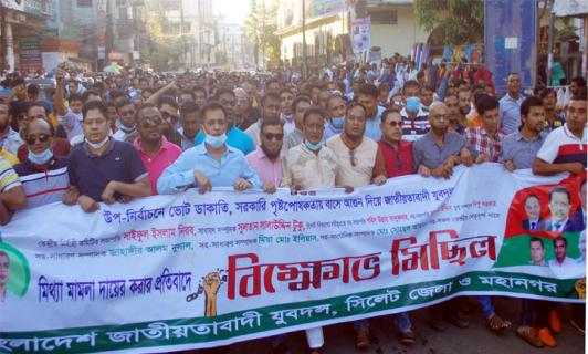 বাসে অগ্নিসংযোগের প্রতিবাদে সিলেট মহানগর যুবলীগের বিক্ষোভ সমাবেশ