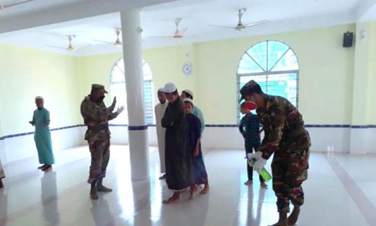 সিলেটে মসজিদে জীবাণুনাশক ছিটানো ও সামাজিক দূরত্ব নিশ্চিতে তৎপর সেনাবাহিনী