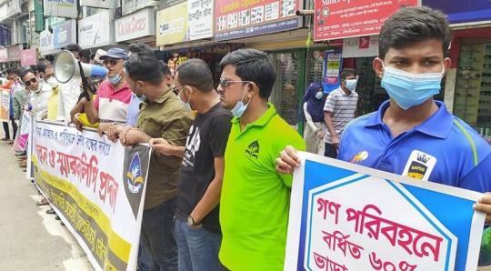 গণপরিবহনে নৈরাজ্যের প্রতিবাদে মৌলভীবাজারে মানববন্ধন