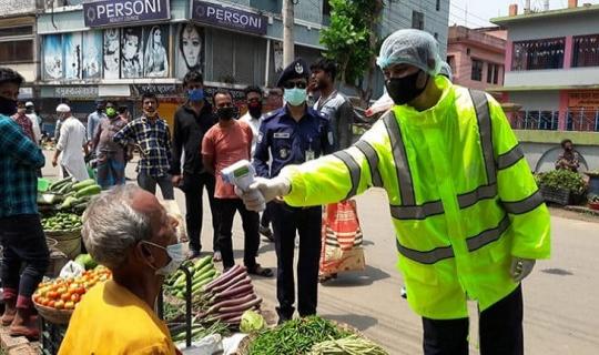 মৌলভীবাজারে থার্মাল স্ক্যানারে তাপমাত্রা নির্ণয় করছে পুলিশ