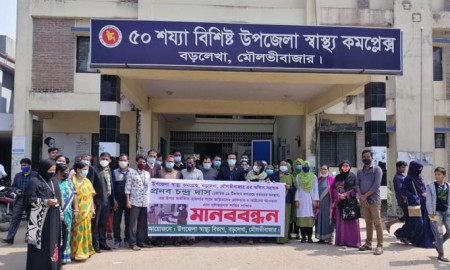 বড়লেখায় স্বাস্থ্য কমপ্লেক্সের কর্মচারীকে মারধরের অভিযোগে মানববন্ধন