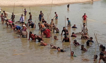 কমলগঞ্জে ধলাই নদীতে মাছ ধরা উৎসব