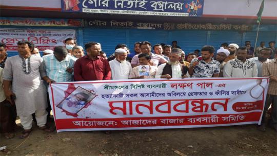 রাজনগরে ব্যবসায়ী হত্যার প্রতিবাদে মানববন্ধন ও প্রেস ব্রিফিং