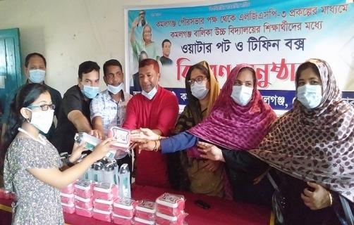 কমলগঞ্জে শিক্ষার্থীদের মাঝে পানির বোতল ও টিফিন বক্স বিতরণ