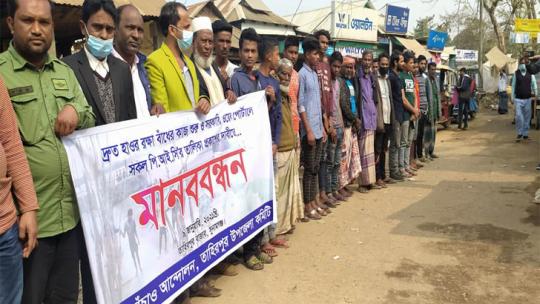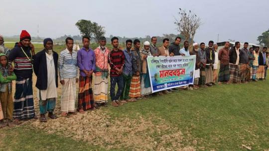তাহিরপুরে ফসলরক্ষা বাঁধের কাজ শুরুর দাবিতে মানববন্ধন