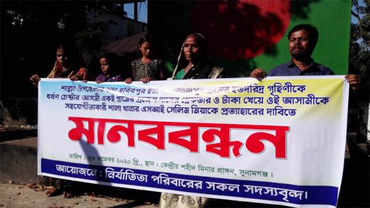 সুনামগঞ্জে নারী নির্যাতনকারীর বিচারের দাবিতে মানববন্ধন