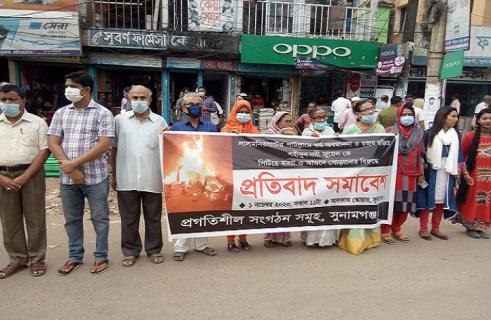 যুবককে আগুনে পুড়িয়ে হত্যার প্রতিবাদে সুনামগঞ্জে মানববন্ধন
