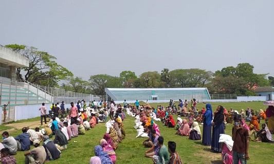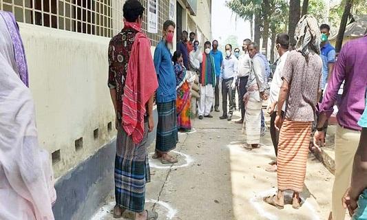সুনামগঞ্জে নিরাপদ দূরত্বে থেকে ত্রাণ গ্রহণ