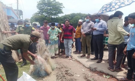 ধর্মপাশায় ২০ কেজি নিষিদ্ধ কারেন্ট জাল ধ্বংস