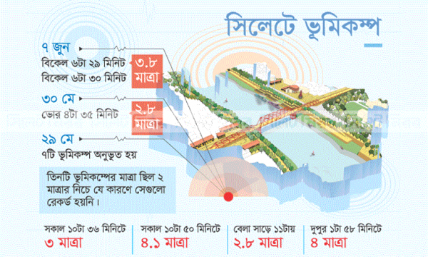 গতকাল সোমবার সন্ধ্যা ৬টা ২৯ মিনিট ও ৬ টা ৩০ মিনিটে দুই দফা ভূমিকম্প হয়। রিখটার স্কেলে মাত্রা ছিল ৩ দশমিক ৮। উৎপত্তিস্থল দক্ষিণ সুরমার জালালপুর। বিশেষজ্ঞরা বলছেন ছোট ছোট ভূমিকম্প বড় ভূমিকম্পের শঙ্কা জাগায়। তাই বলে শঙ্কিত হলে চলবে না। ক্ষয়ক্ষতি কমানোর প্রস্তুতি নিতে হবে।