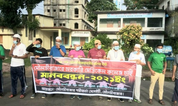 মৌলভীবাজারে সরকারি মেডিকেল কলেজের দাবিতে মানববন্ধন করেছে জেলা শরীরচর্চা সোসাইটি।