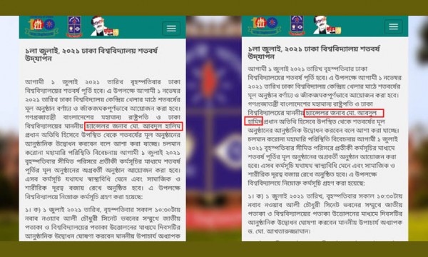 শুক্রবার (১৮ জুন) ওয়েবসাইটে প্রকাশিত বিশ্ববিদ্যালয়ের বিজ্ঞপ্তিতে এ ভুল দেখা যায়। এতে লেখা ছিল, ‘আগামী ১ জুলাই ঢাকা বিশ্ববিদ্যালয়ের শতবর্ষ পূর্তি হবে। এ উপলক্ষে আগামী ১ নভেম্বর ২০২১ তারিখ ঢাকা বিশ্ববিদ্যালয় কেন্দ্রিয় খেলার মাঠে শতবর্ষের মূল অনুষ্ঠান বর্ণাঢ্য ও জাঁকজমকপূর্ণভাবে আয়োজন করা হবে। গণপ্রজাতন্ত্রী বাংলাদেশের মহামান্য রাষ্ট্রপতি ও ঢাকা বিশ্ববিদ্যালয়ের মাননীয় চ্যান্সেলর জনাব মো. আবদুল হালিম প্রধান অতিথি হিসেবে উপস্থিত থেকে শতবর্ষের মূল অনুষ্ঠানের আনুষ্ঠানিক উদ্বোধন করবেন বলে আশা করা যাচ্ছে।’