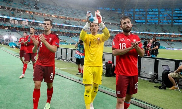 ইউরোপিয়ান চ্যাম্পিয়নশিপে তুরস্ককে হারিয়ে শেষ ষোলোয় খেলার আশা বাঁচিয়ে রাখল সুইজারল্যান্ড। গতকাল রবিবার বাকু অলিম্পিক স্টেডিয়ামে অনুষ্ঠিত গ্রুপের শেষ ম্যাচে তুরস্ককে ৩-১ গোলে হারিয়ে তৃতীয় স্থান নিশ্চিত করেছে সুইজারল্যান্ড। ছয়টি গ্রুপে তৃতীয় হওয়া ছয় দলের মধ্যে শীর্ষ চারে থেকে শেষ ষোলোয় ওঠার আশা বাঁচিয়ে রাখল সুইসরা