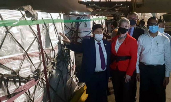বিমানবন্দরে টিকাগুলো গ্রহণ করেন পররাষ্ট্রমন্ত্রী ড. এ কে আব্দুল মোমেন ও স্বাস্থ্যমন্ত্রী জাহিদ মালেক।