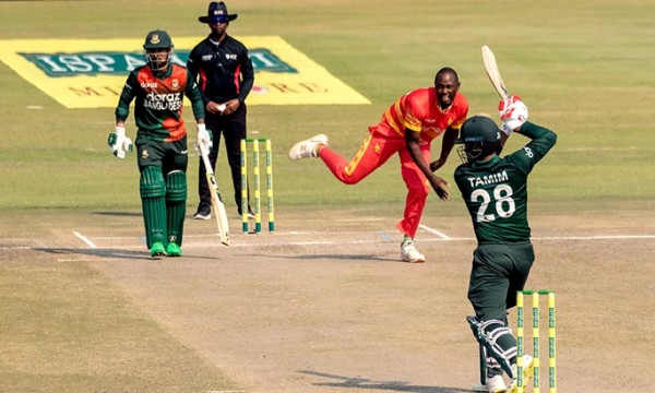 সিরিজ জয় আগেই নিশ্চিত করেছিল বাংলাদেশ। বাদ ছিল জিম্বাবুয়েকে ধবলধোলাই দেওয়া। সিরিজের তৃতীয় ওয়ানডেতে জিম্বাবুয়ের দেওয়া বড় টার্গেট তাড়ায় বাংলাদেশকে ভালো শুরু এনে দেন তামিম ইকবাল এবং লিটন দাস। তাদের সাবলীল ব্যাটিংয়ে ৪৮ বলেই পঞ্চাশ ছুঁয়ে ফেলে টাইগারদের ইনিংস। ৫৯ বলে পঞ্চাশ পূরণ করেন তামিম ইকবাল। এক পর্যায়ে মনে হচ্ছিল ওপেনিং জুটি তিন অংক ছুঁয়ে ফেলবে। তবে দলীয় ৮৮ রানে মাধভেরের বলে ক্যাচ দিয়ে বিদায় নেন লিটন দাস (৩২)। উইকেটে আসেন সাকিব। লিটনের আউটেও রানের গতি কমেনি। এই জুটির অবসান হয় ৫৯ রানে। লুক জঙ্গুইয়ের বলে উইকেটের পেছনে ক্যাচ দিয়ে ফিরেন সাকিব (৩০)।