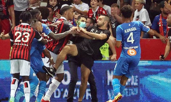 মাঠের নিরাপত্তাকর্মীরা একটা বলয় তৈরি করে ফেলেন ততক্ষণে, যাতে সমর্থকেরা মাঠে ঢুকে পড়তে না পারেন। পুলিশও চলে আসে। কিন্তু ততক্ষণে নিসের সমর্থকরা মাঠে প্রবেশ করে মার্শেইর খেলোয়াড়দের ওপর চড়াও হয়। পরে ফুটবলার থেকে সংঘর্ষটি কোচদের মাঝেও ছড়িয়ে পড়ে। দুই দলের যুদ্ধংদেহী খেলোয়াড়, সমর্থক, স্টাফ মিলে এক রণক্ষেত্র যেন! শেষ পর্যন্ত ম্যাচটি স্থগিতের সিদ্ধান্ত নেওয়া হয়।