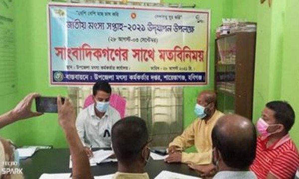 হবিগঞ্জের শায়েস্তাগঞ্জে জাতীয় মৎস্য সপ্তাহ-২০২১ উপলক্ষে সাংবাদিকদের সাথে এক মতবিনিময় সভা করেছে উপজেলা মৎস্য অধিদপ্তর।