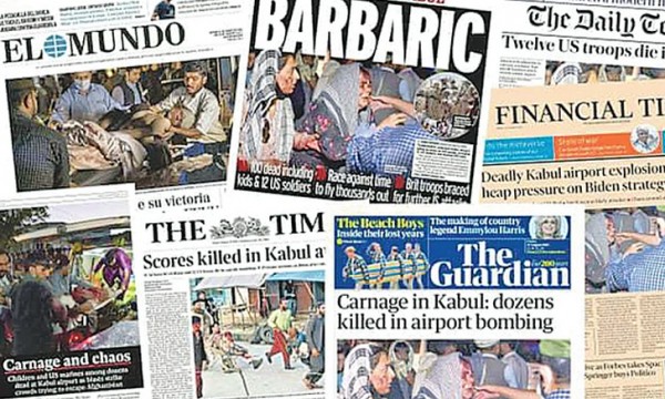 আফগানিস্তানের কাবুলে হামিদ কারজাই বিমানবন্দরে গত বৃহস্পতিবার সন্ত্রাসী হামলার খবর সারা বিশ্বের পত্র–পত্রিকার প্রথম পাতার শিরোনামে স্থান করে নিয়েছে। অনেক পত্র–পত্রিকাই তাদের খবর পরিবেশন করেছে বোমা বিস্ফোরণের পর রক্তাক্ত ও হতবিহ্বল দুই নারীর একটি ছবি জুড়ে দিয়ে। খবর দ্য গার্ডিয়ান।