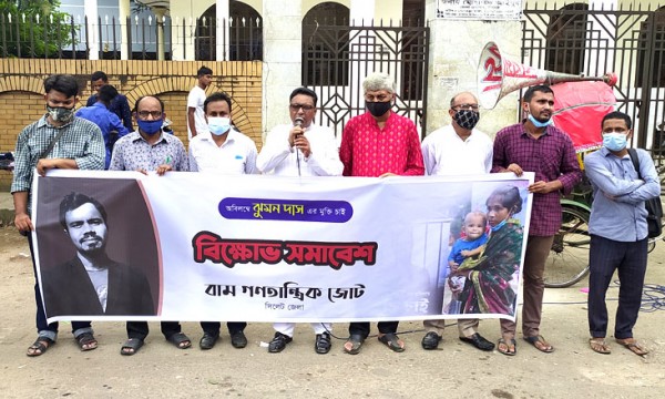 বক্তারা আরও বলেন, ‘ঝুমন দাস তার পরিবারের একমাত্র উপার্জনকারী ব্যক্তি। দীর্ঘদিন তিনি জেলে থাকায় তার পরিবার ক্ষতিগ্রস্ত হচ্ছে। শিশু বাচ্চাকে কুলে নিয়ে তার স্ত্রীকে স্বামীর মুক্তির দাবিতে রাজপথে আন্দোলন করতে হচ্ছে। যা খুবই অমানবিক। তাই অবিলম্বে ঝুমন দাসের মুক্তি দিতে হবে। তা না হলে সিলেটের সব গণতন্ত্রকামী, প্রগতিশীল সংগঠনকে নিয়ে কঠোর কর্মসূচি গ্রহণ করা হবে।’