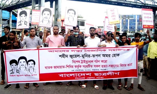 ১৯৮৮ সালের ২৪ সেপ্টেম্বর সিলেটের মাটিতে জামায়াত-শিবির চক্রের হাতে নিহত মুনির এ কিবরিয়া চৌধুরী, তপন জ্যোতি দে ও এনামুল হক জুয়েলের ঘাতকদের বিশেষ ট্রাইব্যুনালের মাধ্যমে বিচারের সম্মুখীন করার দাবি জানিয়েছে সিলেট জেলা ছাত্রলীগ (জাসদ)।