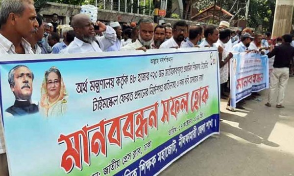 মানববন্ধনে অংশগ্রহণকারী শিক্ষকরা জানান, প্রধানমন্ত্রী শেখ হাসিনা ২৬ হাজার প্রাথমিক বিদ্যালয় জাতীয়করণ করার পর সেসব প্রাথমিক বিদ্যালয়ের ৩৭ হাজার শিক্ষকের জ্যেষ্ঠতার ৫০ শতাংশ টাইমস্কেল প্রদান করা হয়। গত বছরের আগস্টে অর্থ মন্ত্রণালয়ের একটি প্রজ্ঞাপন জারির মাধ্যমে শিক্ষকদের টাইমস্কেল বন্ধ করতে বলা হয়। বর্তমানে যাঁরা অবসরে যাচ্ছেন তাঁদের এ অর্থ পরিশোধ করা হচ্ছে না। ৭৪ বিধি মোতাবেক শিক্ষকদের টাইমস্কেলের অর্থ প্রদান করা হলেও সেটি বন্ধ করার সিদ্ধান্ত নেওয়া হয়। এটি বহাল রাখতে শিক্ষকদের পক্ষ থেকে আদালতে মামলা দায়ের করা হয়। বর্তমানে সেটি বিচারাধীন।
