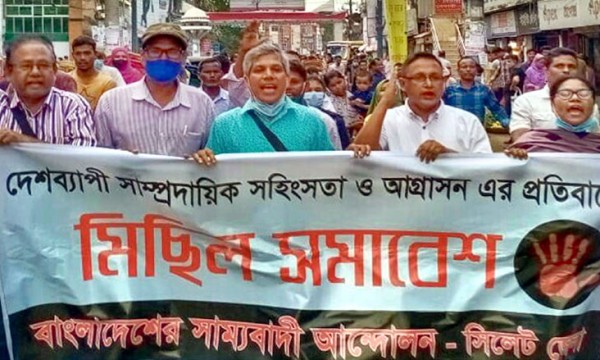 দেশব্যাপী ধর্মীয় সংখ্যালঘু সম্প্রদায়ের উপর হামলা, প্রতিমা ভাংচুর, অগ্নিসংযোগ সহ সাম্প্রদায়িক হামলার প্রতিবাদে সিলেটে প্রতিবাদ মিছিল ও সমাবেশ করেছে সাম্যবাদী আন্দোলন। আজ সোমবার (১৮ আক্টেবর) সিলেট জেলা শাখার উদ্যোগে বিক্ষোভ মিছিল ও সমাবেশ অনুষ্ঠিত হয়।