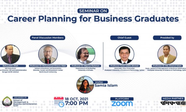 শাহজালাল বিজ্ঞান ও প্রযুক্তি বিশ্ববিদ্যালয়ের (শাবিপ্রবি) স্কুল অব ম্যানেজমেন্ট অ্যান্ড বিজনেস অ্যাডমিনিস্ট্রেশন অনুষদের উদ্যোগে ‘ক্যারিয়ার প্ল্যানিং ফর বিজনেস গ্র্যাজুয়েটস’ শীর্ষক কর্ম কর্মশালা অনুষ্ঠিত হয়েছে।