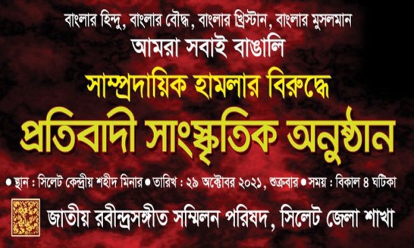 সারাদেশে সাম্প্রদায়িক হামলার প্রতিবাদে আগামীকাল শুক্রবার সিলেটে প্রতিবাদী সাংস্কৃতিক অনুষ্ঠান অনুষ্ঠিত হবে।